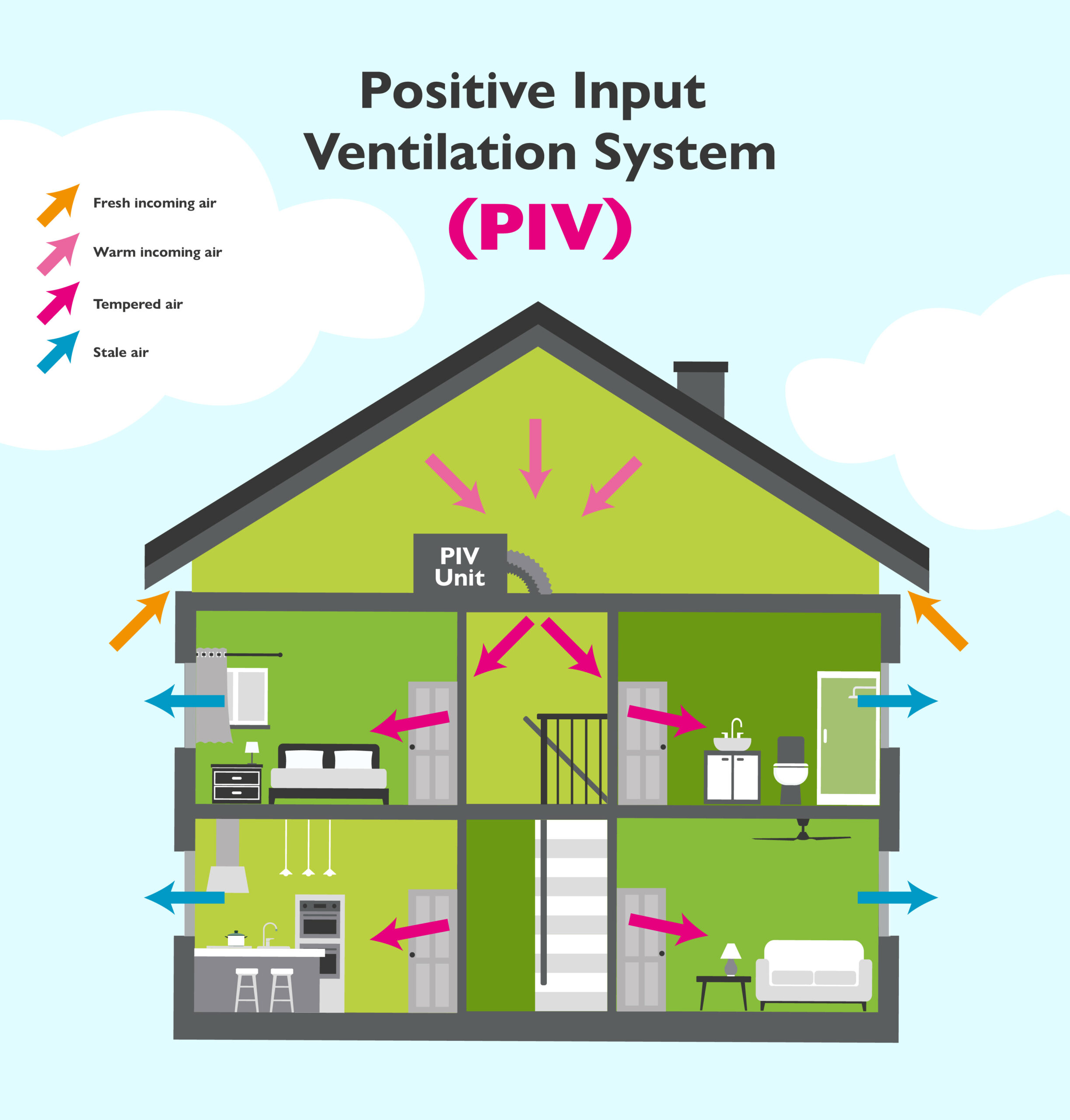 Condensation and black mould don’t happen by magic. They’re a sign your home is holding on to moisture and stale air. A PIV unit fixes that by pushing a gentle flow of filtered, fresh air from your loft into the house. That slight positive pressure moves the old, damp air out through trickle vents and gaps, so your rooms stay drier and fresher.